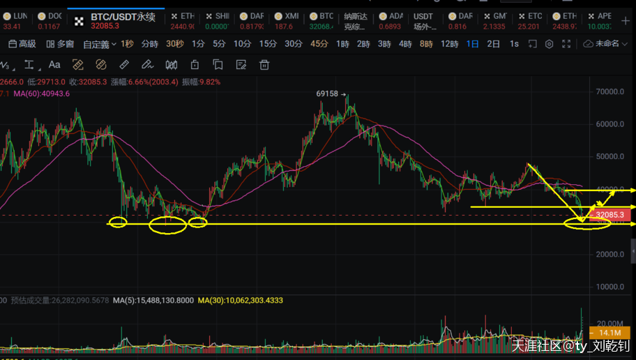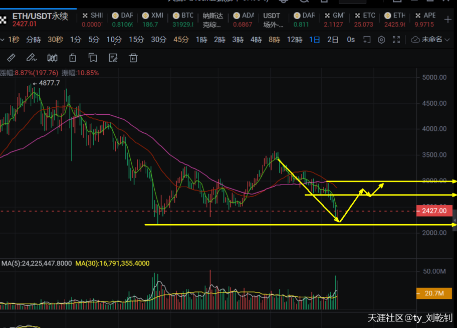 不破不立,破而后利。昨日市场迎来了近期以来的大幅终极下跌砸盘,比特币盘中最低跌破30000整数关口附近,以太也下跌幅度不小,最低跌至,2200一线,盘中大幅下挫之后迎来了阶段性的测试支撑,同时也走出了像样的反弹,出来,小级别来看,符合变盘的预期,接下来不说马上反转走大牛,小级别阶段性反弹一波是大概率事件,不要因为昨天的大跌之后今天上头继续追空,谨慎对待。