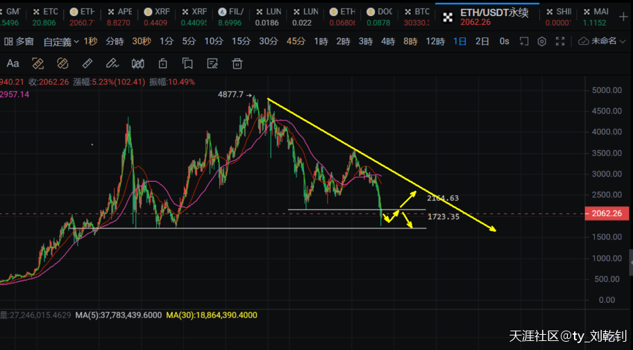 以太坊的表现相对来说企稳的更加彻底,前期的强支撑位1700一线本次下跌并没有破位,相对来说表现的更加稳定,短期内行情向下回落的话可以关注一下这一强支撑位置的有效性,不排除会有二次补跌试探支撑位置的有效性,所以以太虽然没有跌破支撑,但是短期内日线表现的也不是特别的明显,有可能会有补跌的行情出现,大方向目前弱势当中,行情直接反转的可能性有,但是也不能排除在底部运行一段时间之后企稳再次走高,上方需要重点关注的是2170一线的前期低点压力位的有效性,能够强势上破这一压力位的话,那就是多头力量逐渐占据主导后市一步步反弹去测试上方下行趋势线压力位2700附近,则以大趋势的反弹思路去对待。日内短线,先看回落下去能走出小时线企稳信号之后参与多单。