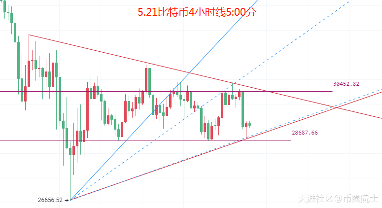 4小时线承压三角口和速阻线,MACD缩量下行,K线承压并没有下去,支撑在28800之上,布林带横盘比较疲软,1小时K线向上回调,KDJ金叉成型,MACD缩量上行,短线可以看到上方阻力较强,思路上延续昨日建议即可,