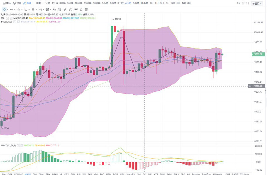 四小时后图上看,布林带呈收口姿态,价格上行打破下中轨阻力位置,直接重新回到中上轨区域,目前走势受阻于9850位置,价格出现一波回落,但在中轨线附近出现反弹,价格是又回到了9700上方,下方均线在9600-9650位置区域行出现强力支撑区域。bb预计在这一区域价格会再度迎来一波反弹。