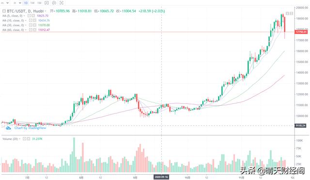 进入2020年以后除过3月份的黑天鹅事件导致比特币的价格严重失真下跌到了3800美元,这波上涨趋势截止到目前为止,最高点始终没能突破2万美元止步在了19500美元附近。11月26日美国的感恩节,也就是今天,比特币迎来了2000美元的下跌幅度,从19000 美元一路下跌至最近17000美元。