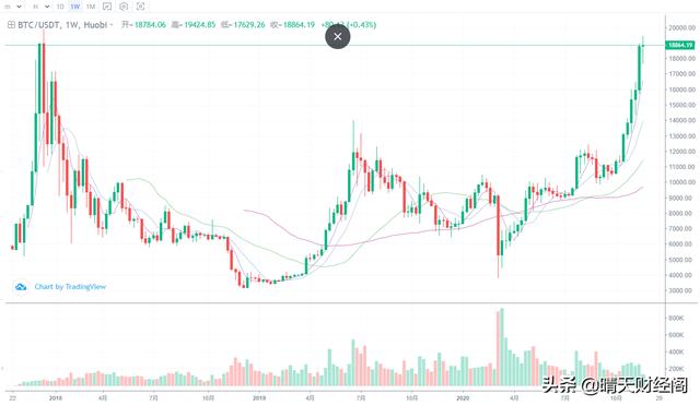 进入2019年之后比特币的高点出现在了6月份前后,价格对应的高点没有突破1.4万美元。即便是在技术面的分析中,把它看成是自2018年高点下落之后的B浪反弹,但同样在2019年的12月比特币的价格回落到了6400美元附近,开启了这一波的上涨。