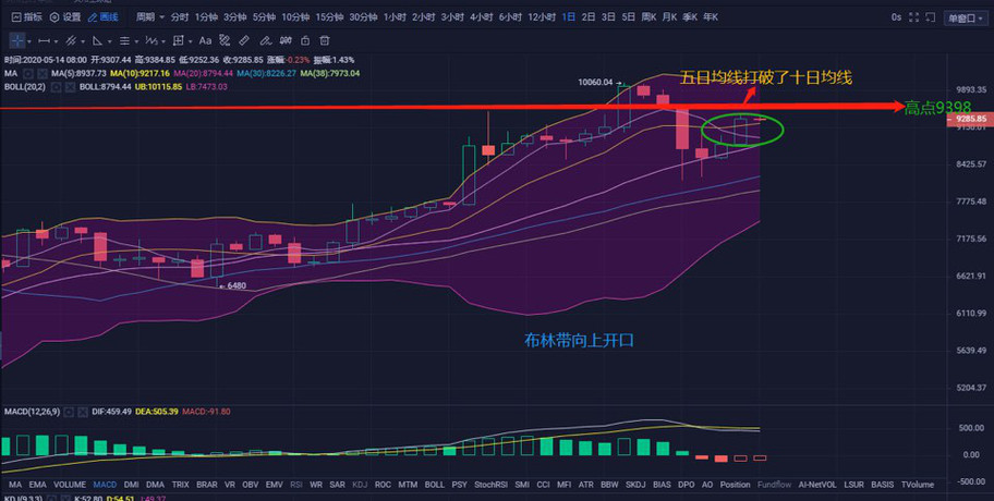 行情分析:从日线图来看,昨日大饼是一个阳线收尾,多头占优势,下方压制许久的十日均线终于被五日均线打破,价格受阻到9400位置,附近但回落力度不深,低点止到了9200位置,目前布林带微微向上开口,下方五日均线下行至8950形成支撑点。