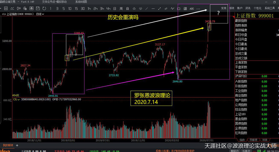 2、上证指数这波自2020年3月19日起动以来的上涨行情,我们参照历史轨迹进行分析和研判,拿最近的一波上涨行情来作为参照物:上证指数2019年1月4日~2019年4月8日的大涨行情。二者目前看,有比较相似的走势,后市的走势可以参考前期的走势类推,历史会重演吗?让我们拭目以待,波浪理论图解如下: