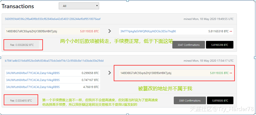 四天后他凌晨一点给我打电话告诉我行情不好赶紧卖出,因为太晚不能见面说,他就远程指导我全部从Trezor 钱包转账到货币交易大厅。期间我发起的两次交易一直报错并没有提示成功,但我发现账户钱没了,还以为已经成功。当时我选的是普通交易速度的手续费,但是他说了一句,他给我付高额手续费提速了,这也让我怀疑最后卖出交易并不是我做的,但当时比较晚且因为操作不熟练就没质疑。