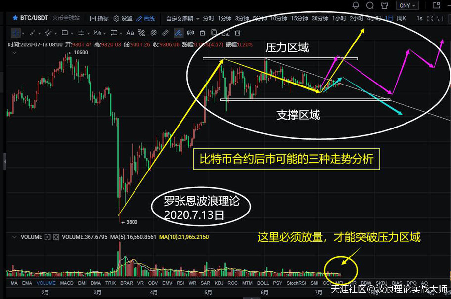 二、数字货币比特币BTC永续合约分析,波浪理论实战图解,这个位置属于可上可下的区域,筹码集中度很高,往上压力重重,往下也是层层的支撑,近日重点观察,如果要向上突破,必须放量大阳突破,迅速的脱离筹码密集区,否则横久必跌。