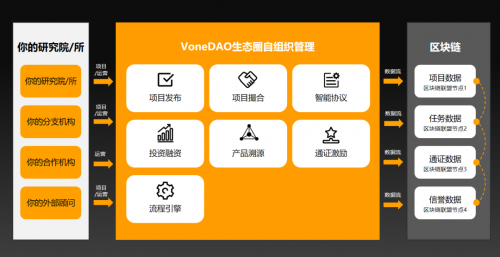 多机构协作的研究院/所组织,通过VoneDAO平台,实现跨机构项目的协作运营,项目全生命周期全程上链。覆盖研发项目、投融资项目、产品溯源等项目类型。