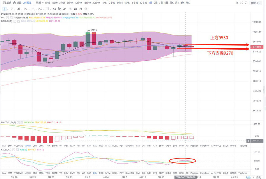 从日线图上看,昨日是一根阴线收尾,布林带呈张口趋势,价格波动被压缩,上方高点有所下移,K线受MA10均线压制,目前价格在布林带下轨位置反弹后,重新回到9440附近。但上方量能已经消耗殆尽,价格上行相当困难。MACD两线向下呈平行趋势,KDJ有拐头向下姿态。bb认为若是后续行情进入震荡节奏,那么日内价格还会触及9550位置,若是未走震荡,那么关注下轨支撑9270。