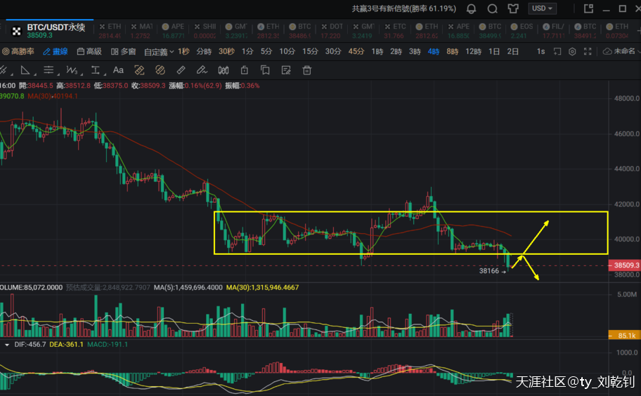 技术面来来说,大饼的下跌破位了39100一线支撑位置之后,接下来反弹这里就会成为强压力位,支撑压力位转换的思路很明确。另外一点就是,行情下跌走出来之后也是在38500附近开始纠结,这里是前期刺破支撑的低点位置,短期内也形成了一个小压力位,所以看小时线上面就是这么运行在这个位置走纠结,那么就大饼来说,这种破位的行情不够彻底,可能也有着一定的刺破嫌疑,那么接下来就是一个等待验证的过程。大方向做出了破位那么谨慎对待去做空思路没问题,但是防止被主力资金来回秀操作,那么39100这个强压力位就是后市运行的一个多空分界线,做空也是反弹去空,上方的理想开空位置就是反弹不破39100一线去布局,而反弹若是升破了39100一线之后我们就得去观望方向了。所以今天整体思路,等行情反弹39100一线开始做空,目标先看38000一线,破位的话看下方37000关口。39100升破的话,放弃做空,谨慎对待,等行情进一步确认之后再考虑是否做多去抄底,在这之前,暂时不做这方面的考虑。