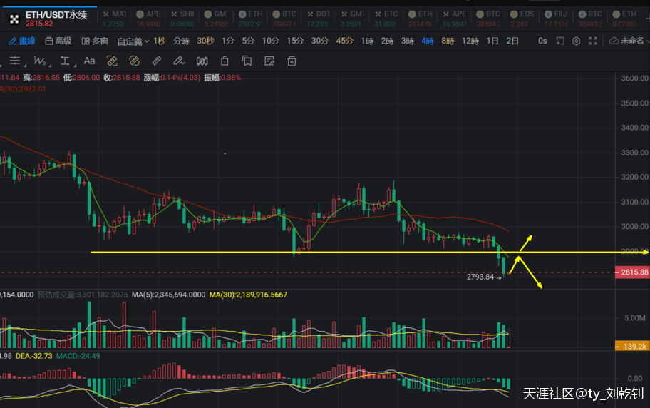 而以太坊的走势就太过弱势了,早间直接砸盘破位了2900关口的强支撑,短期内又走出一个向下延续的走势,一步步刷新过低点,所以以太的表现过于弱势,这也带动了市场上面的大部分山寨币跳水,但是超跌之后可能迎来一个大幅幅度反扑上涨出来,也就是说后市或者说尾盘有可能去触碰尝试2900关口的压力位,那么也存在着一个反弹的短线多单的机会。但是大方向上面来说以太还是明显的空头方向,接下来反弹不破上方2900压力位的话,进一步走低的可能性很大,所以日内以太的思路也是看反弹上去能否去触摸一下2900关口压力,反弹不破压力位则考虑做空。同样的,若是升破压力位的话,日线大概率就是一个向下大幅插针的K线走出了,那大方向就很值得去揣摩了。