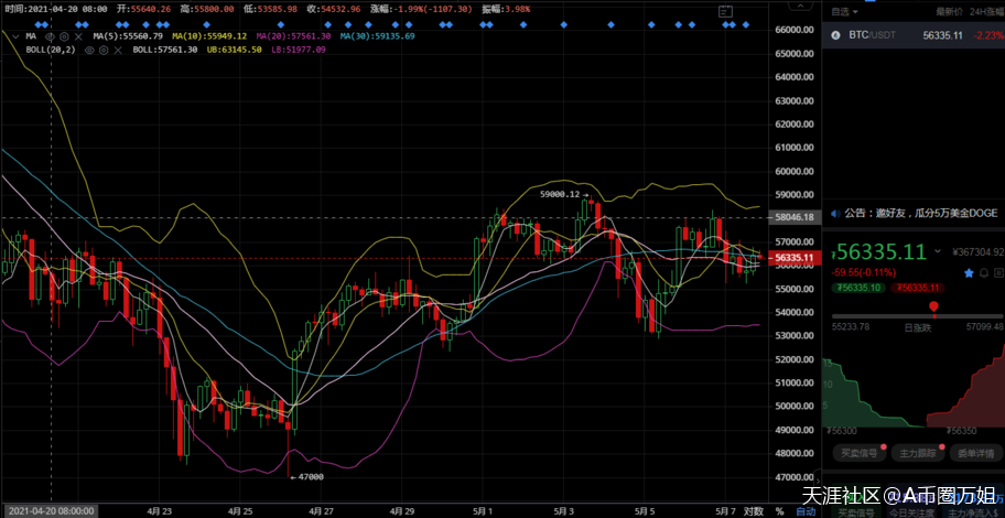 比特币价格昨日先涨后跌但整体保持在区间内波动,经过五一小长假后目前看大饼价格已经止跌,只是暂时未能有效继续上涨,而是陷入了反弹后的区间共振中,日线上布林带缩口走平,价格环绕布林中轨和均线带附近发展,四小时周期内布林带同样秉持缩口持平走势,技术面上MA均线拐头向上,RSI运行至50水平上方,比特币2小时级别走出了一个震荡区间,区间范围在58000至54000,大家要习惯这种拧巴的走势,等到调整结束后,就是真正起飞的阶段,短期难以有大涨大落出现,建议近期思路保持高抛低吸为主,等待价格突破后伺机进场。